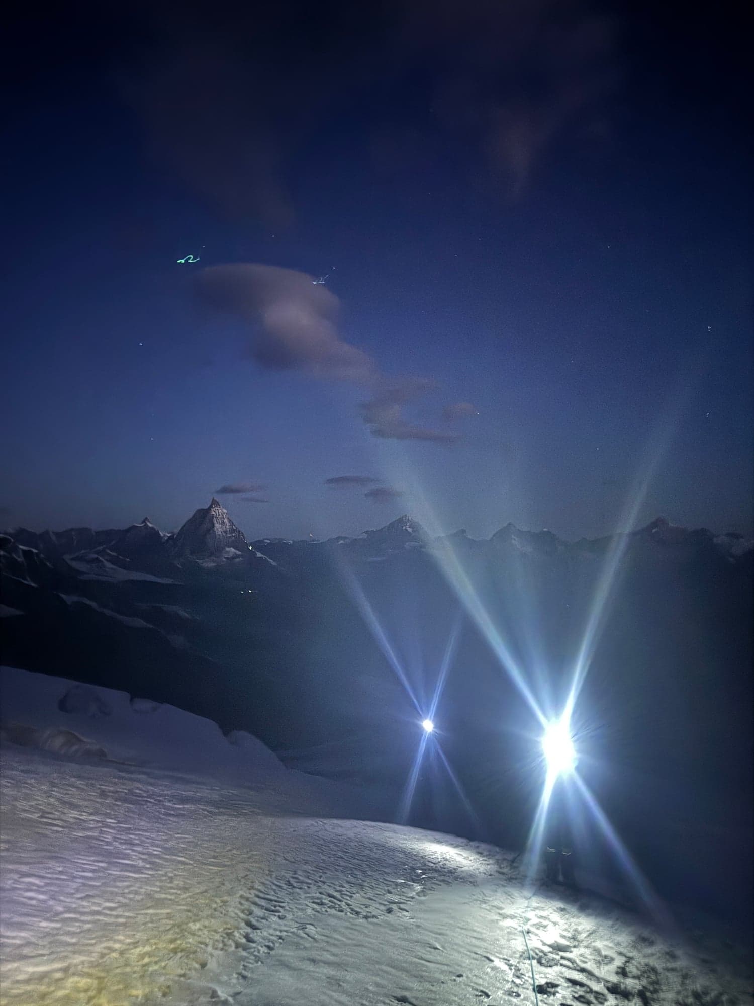 Pátek jsme věnovali aklimatizaci. Rozhodli jsme se projít začátek trasy na Dufourku, hlavně první úsek přes ledovec. Den předtím nám jiná dvojice vyprávěla, jak tam ráno dlouho bloudili mezi trhlinami, tomu jsme se chtěli vyhnout. Takže jsme si trasu prošli za světla, natrénovali orientaci a vyšlápli si až do 4000 m.