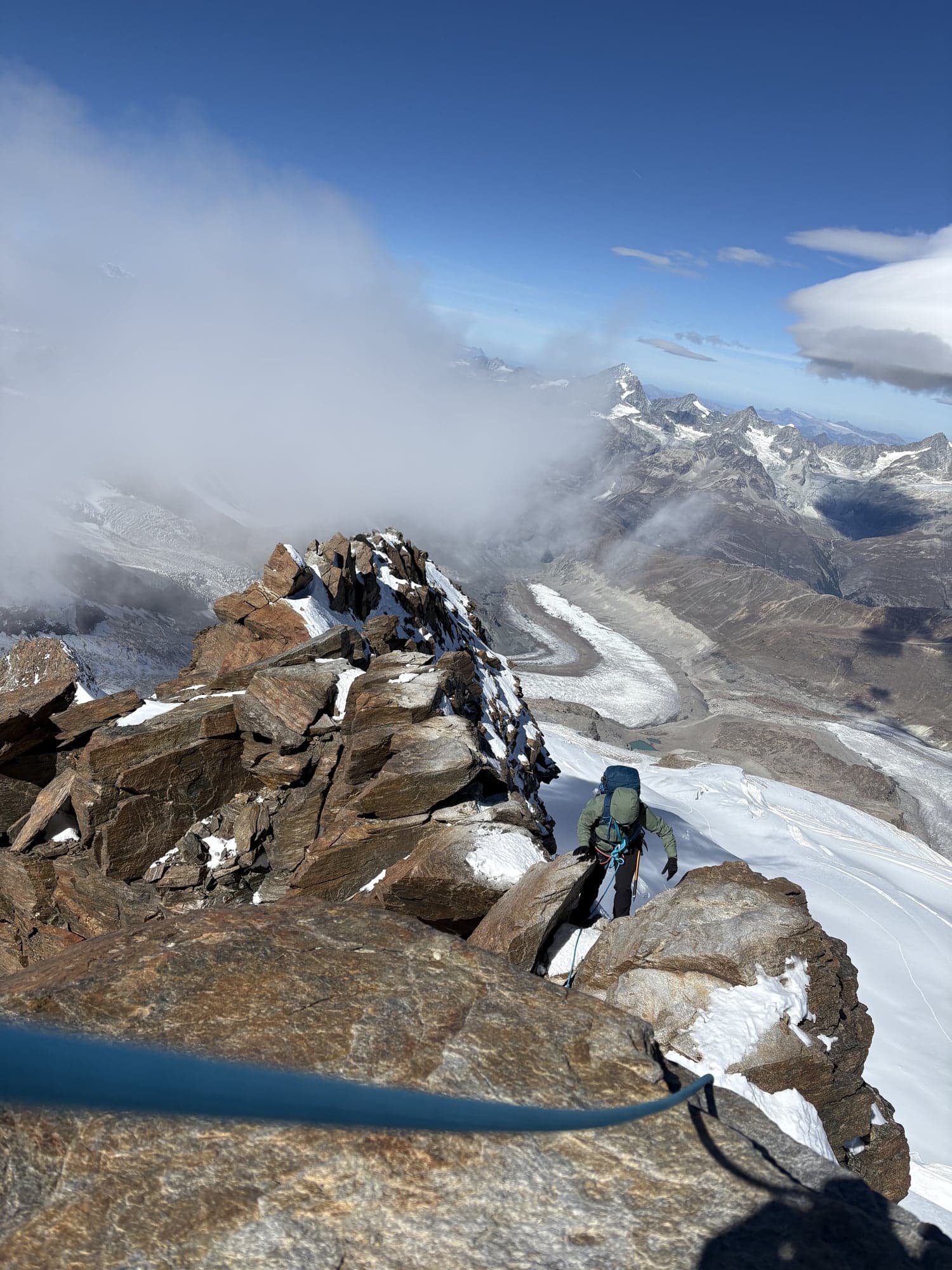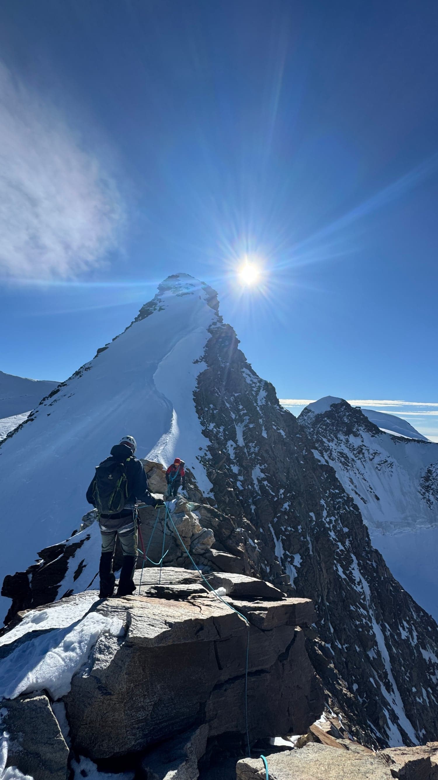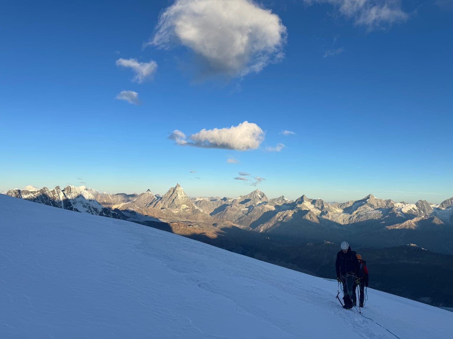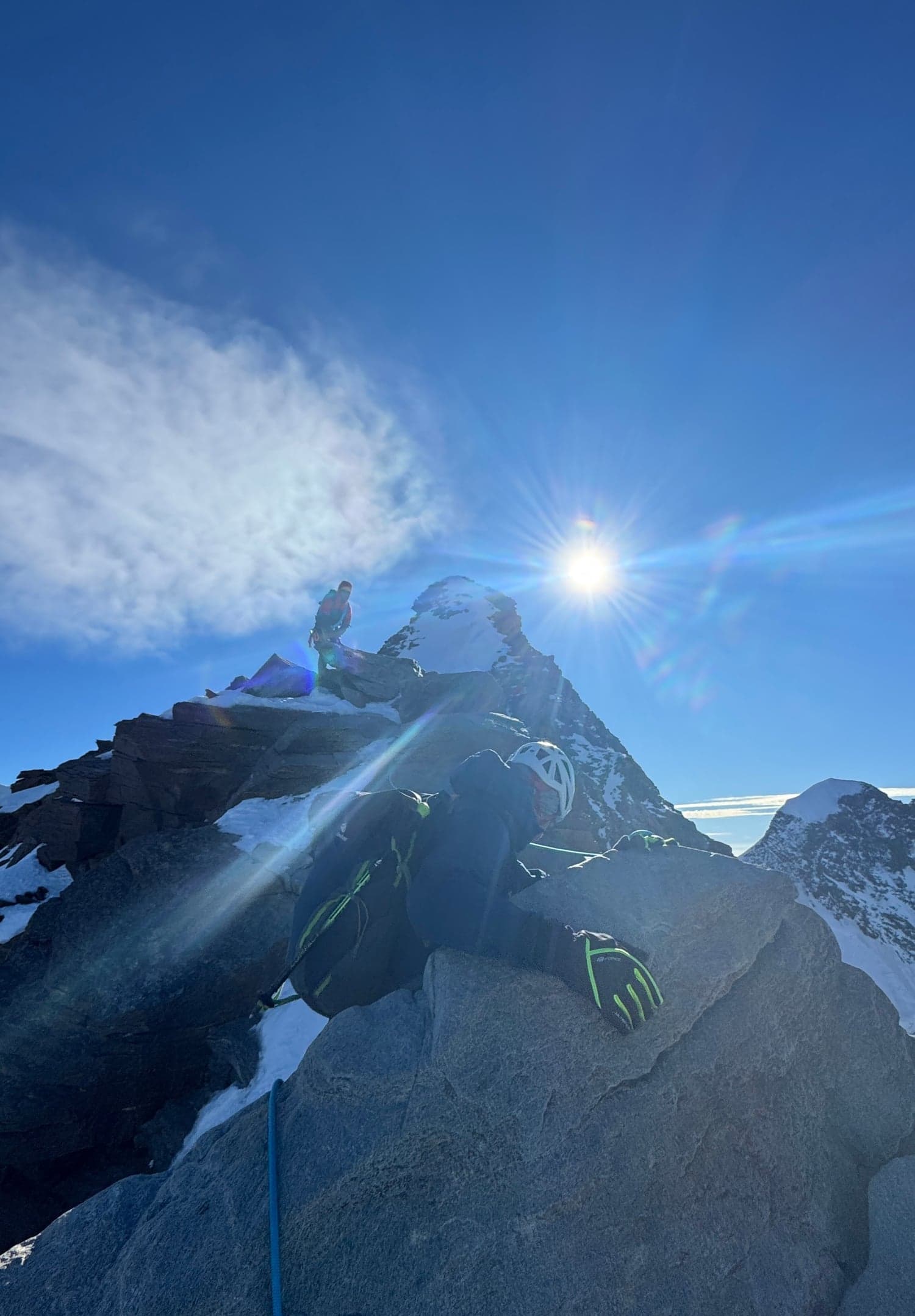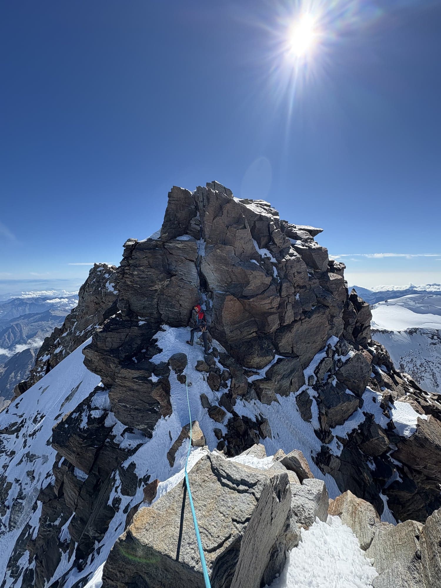 Radek: „Jeden z TOP výstupů. Sice druhá nejvyšší hora Alp, ale Blanc je proti ní sranda. Z vrcholu krásné alpské scenérie. Byly vidět obrovské zaledněné plochy Walliských alp. Nádherné exponované lezení v mixovém terénu. Tím že jsme šli ke konci sezóny, tak hřebínky víc v ledu, než bylo potřeba. Good team vibe a tříchodové menu na večeři!“