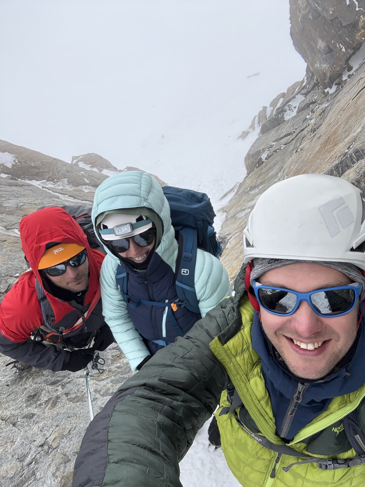 „Ale eště nejsme důle!“ Což je Fakt. Z vrcholu se pokračuje ještě kousek dál po hřebeni a pak na nás čekalo cca 120 m slanění ze železných tyčí. A když jsme se konečně vrátili na ledovec, přišel ještě bonus: sníh se bořil až po kolena, mačky obalené jak sněhové koule a cepíny cinkaly při každém oklepávání.
