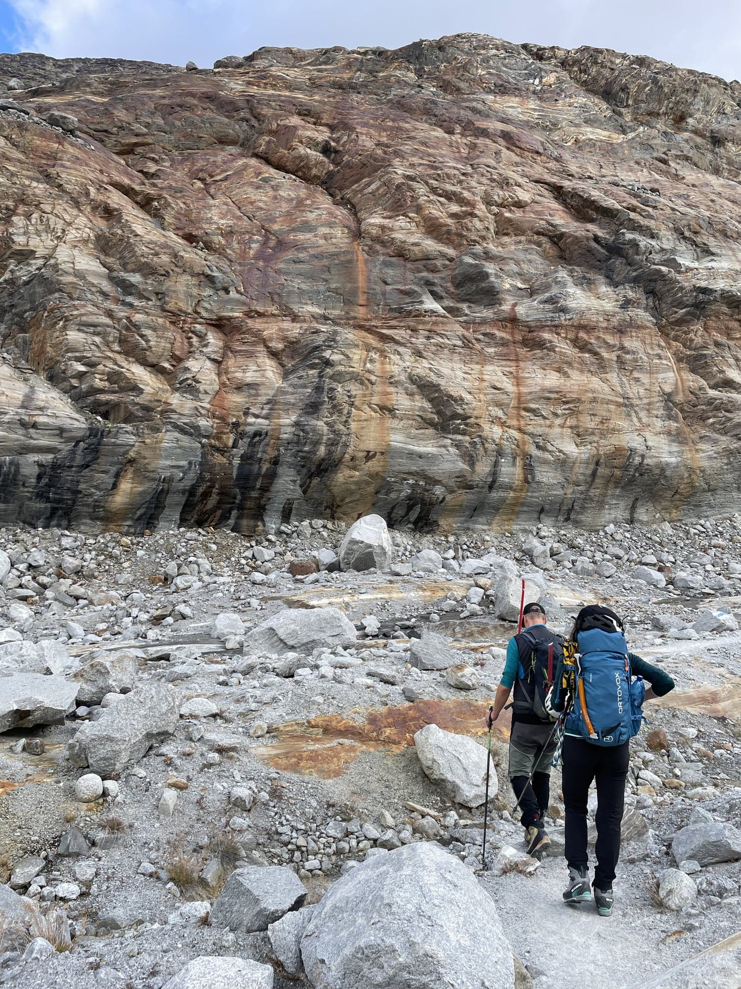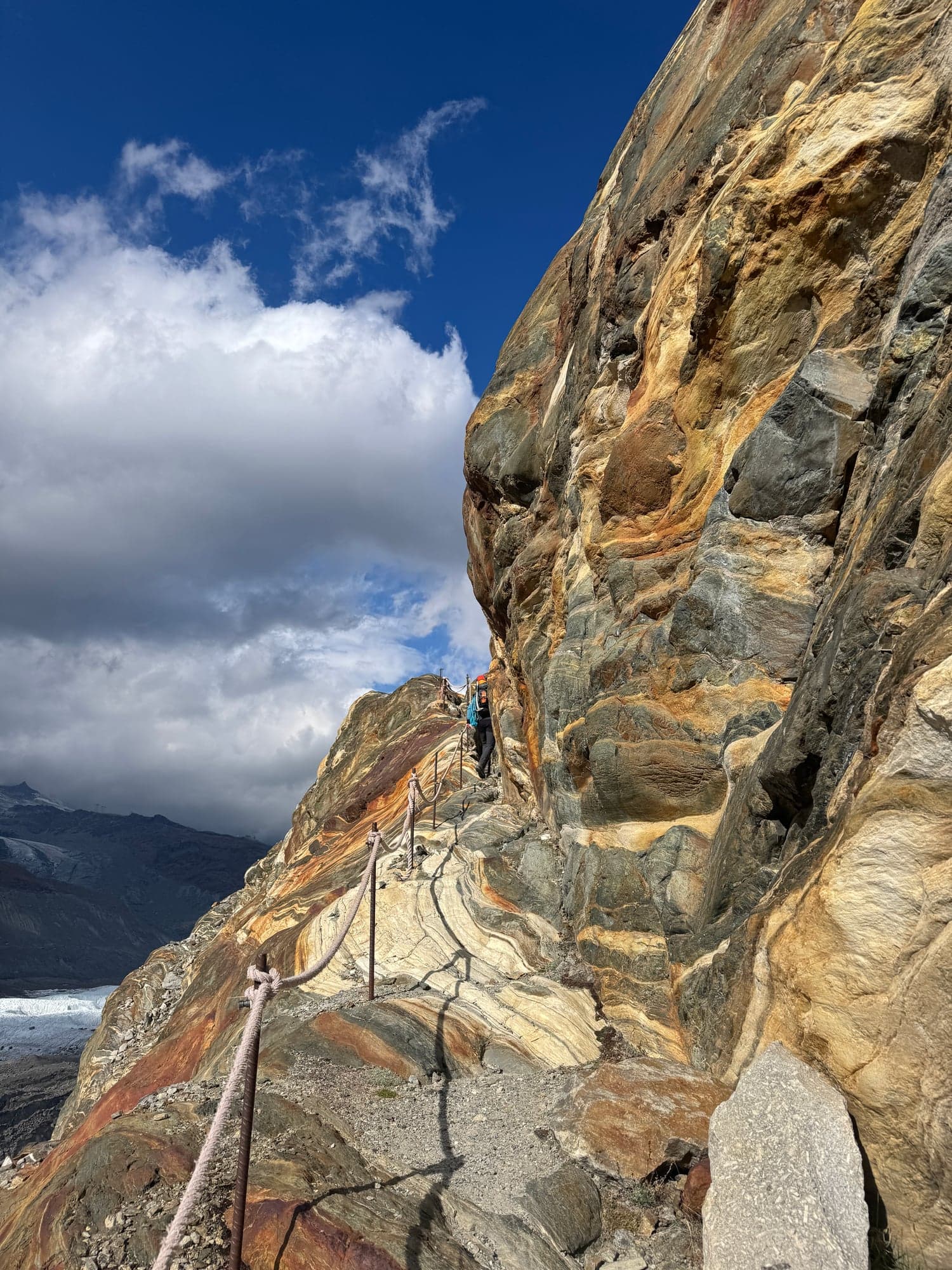 Neděle. Cestu od chaty dolů jsme zvolili druhou spodní variantu. Začátek byl na pohodu, ale konec už byl horší. Jak ledovec ustupuje, cesta se od roku komplikuje. Ale dá se to. Jsou tam pomocná lana, železné úchyty a žebříky.
